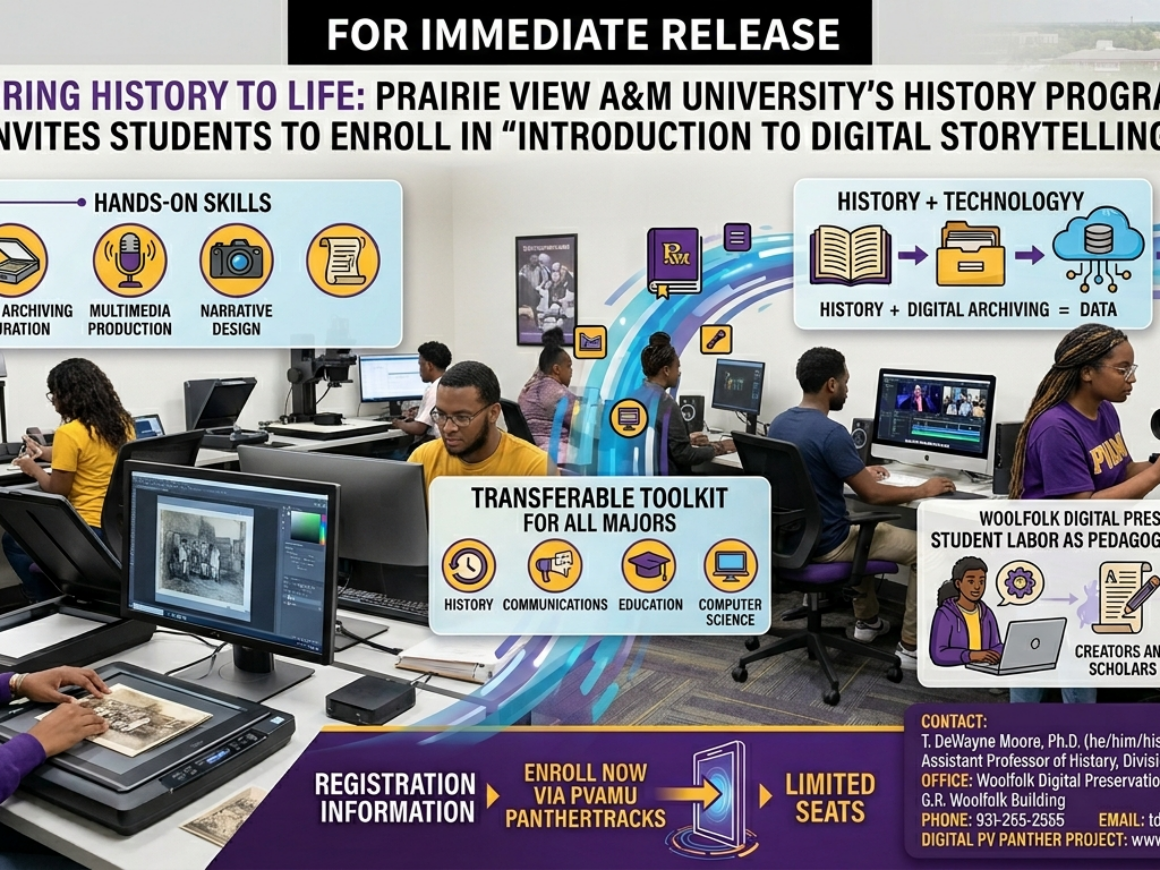PRAIRIE VIEW, Texas — This upcoming semester, the History Program in the Division of Social Sciences at Prairie View A&M University (PVAMU) is calling on students from all disciplines to discover the power of the past through the technology of the future by enrolling in Introduction to Digital Storytelling.